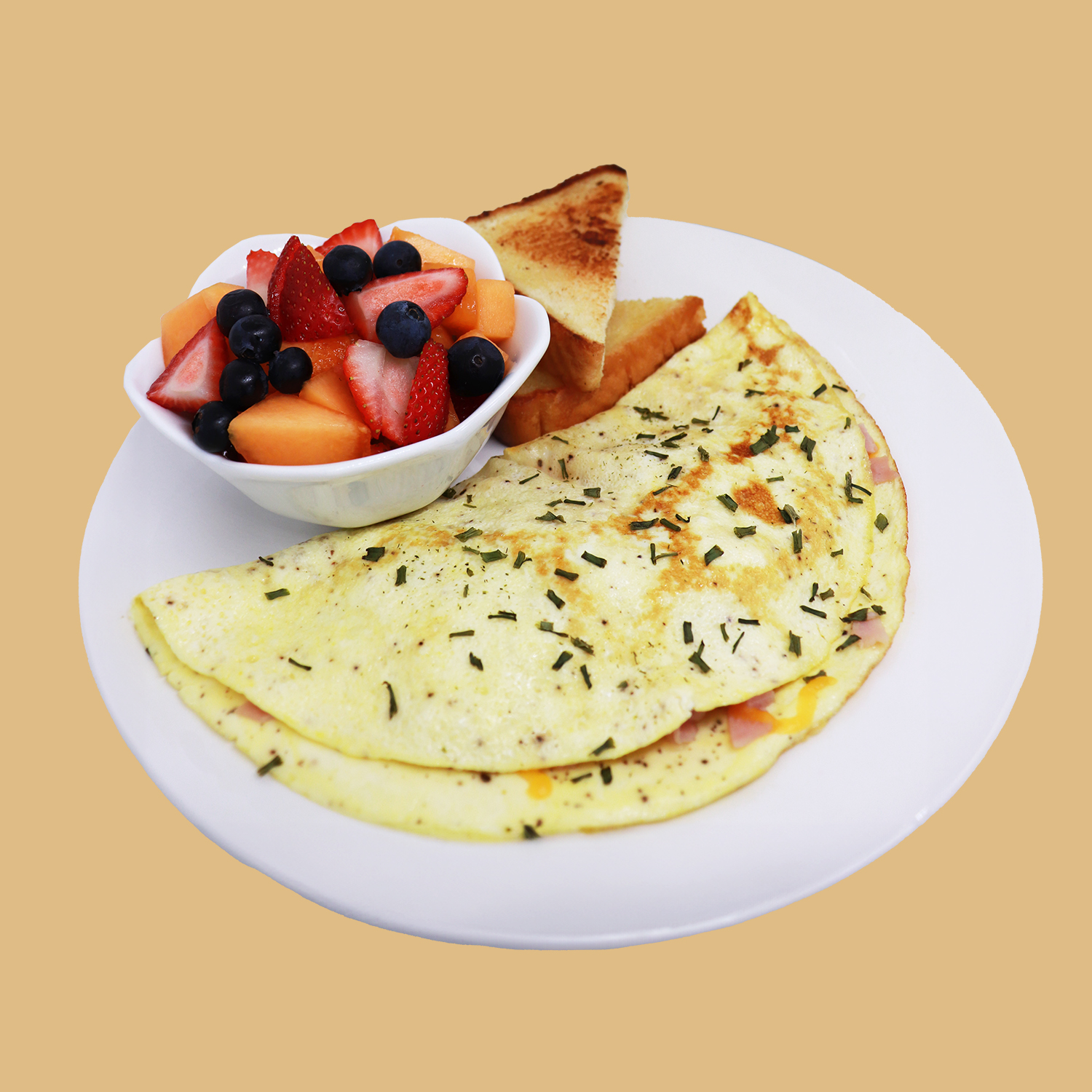 Medley of ham, cheese, and vegetables served with your choice of bread and side of fruit.