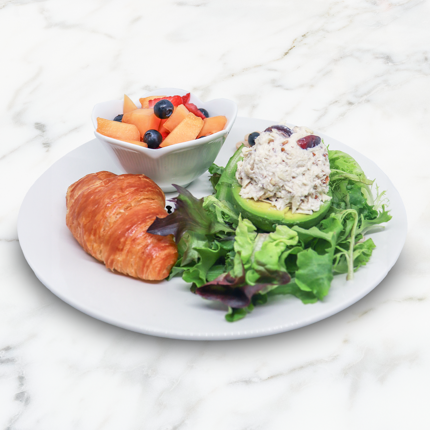 House chicken salad atop half an avocado served on bed of greens with a side of fruit.